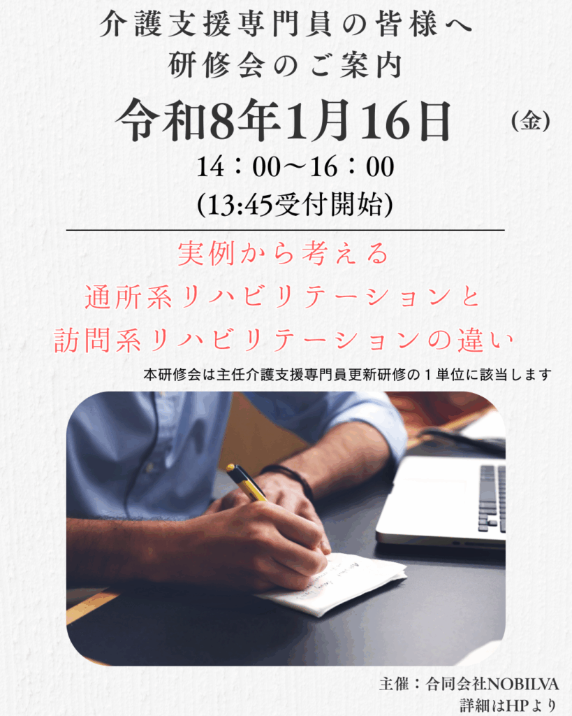 勉強会のお知らせ:主任介護支援専門員更新研修 研修会 2025.11.28日時 令和8年1月16日(金) 14:00~16:00場所 石井町中央公民館 2階小会議室 〒779-3233 徳島県名西郡石井町石井字石井480-1指導者 高橋真由美 様 (まこと居宅介護支援事業所・主任介護支援専門員)定員 16名まで (応募多数の場合は申し込み順とさせて頂きます)詳細および申し込みは下記PDFをダウンロードのうえ、ご使用ください。2026.1_表紙_法定外研修ダウンロード2026.1_介護支援専門員研修会申し込み用紙ダウンロード